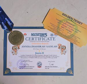 SLEMAN (MTsN 10 Sleman) – Annisa Zhahiirah ‘Aadilah (Azha), murid kelas 9c MTsN 10 Sleman menyabet Juara 2 Olimpiade IPS dalam ajang Mayoga Youth Science Competition #5. Ia berhasil unggul di antara 26 peserta DIY Jateng, Sabtu (7/2). Tak hanya membawa pulang medali dan sertifikat, Azha berhak mendapat Golden Ticket, yakni ditetapkan lolos sebagai calon murid MAN 3 Yogyakarta.