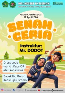SLEMAN (MTsN 10 Sleman) – MTsN 10 Sleman (Matsesa) menggelar kegiatan senam sehat yang berlangsung di dome madrasah Jumat pagi (17/4/2026). Kegiatan yang dimulai pukul 07.00 hingga 08.00 WIB ini diikuti oleh murid, guru, serta pegawai. Tampak pula mahasiswa PPL UIN Sunan Kalijaga turut serta dalam barisan peserta.